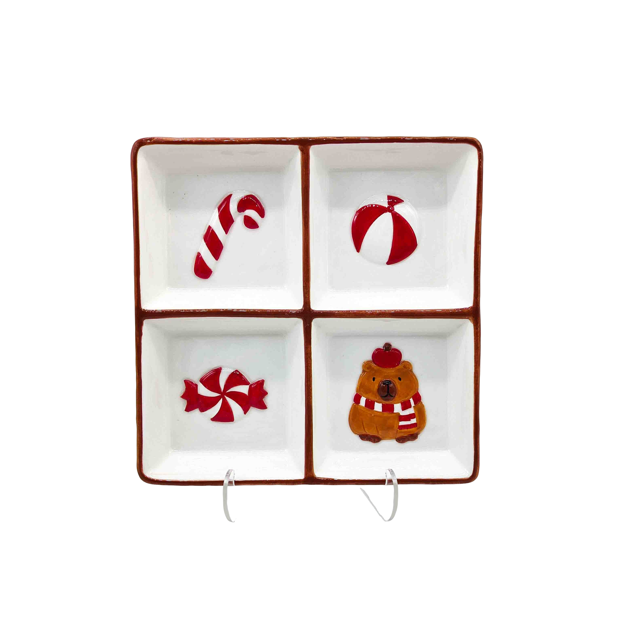 Сервировочная тарелка капибара в рождественском стиле с 4 сетками — это праздничный и практичный предмет керамической посуды, также известный как сервировочная тарелка с 4 сетками в стиле капибары , праздничный набор посуды для капибары и рождественское сервировочное блюдо для капибары . Эта разделенная тарелка имеет симпатичный рождественский дизайн капибары с четырьмя отдельными отделениями и идеально подходит для подачи закусок, фруктов, конфет, десертов и закусок. Он очень популярен среди глобальных оптовиков, импортеров товаров для дома, организаторов праздничных вечеринок и покупателей трансграничной электронной коммерции.